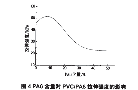 圖4是PVC/PA6共混物的拉伸強(qiáng)度曲線。從圖4可以看出,其變化趨勢(shì)同沖擊強(qiáng)度的變化趨勢(shì)基本一致,都是在PA6含量為10% 時(shí)達(dá)到較大值,此時(shí)共混物的拉伸強(qiáng)度為60MPa,較純PVC提高了30%。當(dāng)PA6含量超過10% ,共混物的拉伸強(qiáng)度逐漸降低;當(dāng)PA6含量超過35% 以后,拉伸強(qiáng)度逐漸趨于平穩(wěn)。從圖3和圖4可以看出,當(dāng)PVC與PA6的配比為90/10時(shí),共混物的缺IzI沖擊強(qiáng)度和拉伸強(qiáng)度都較純PVC有明顯改善。